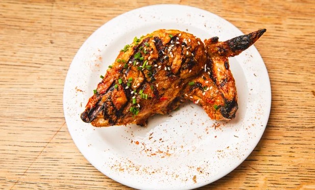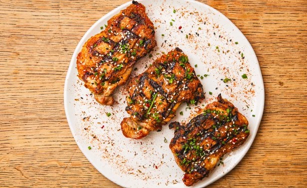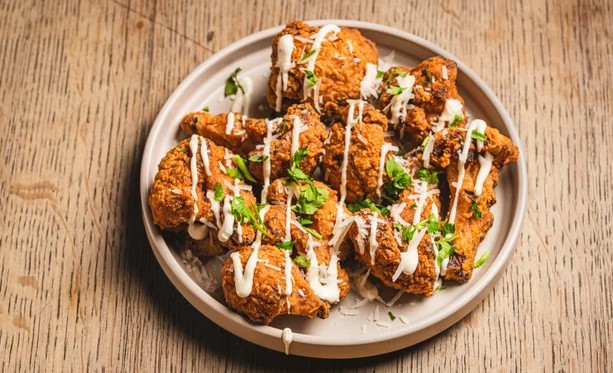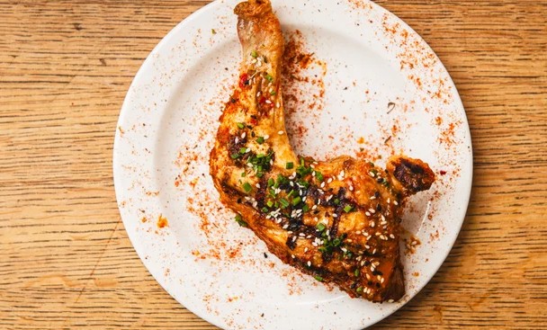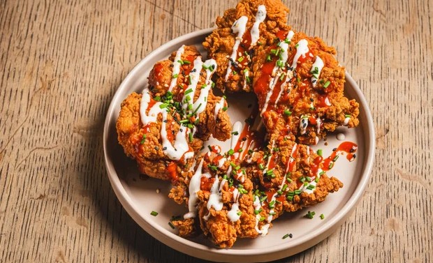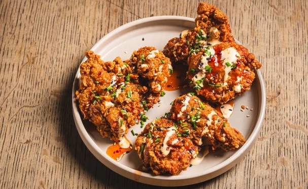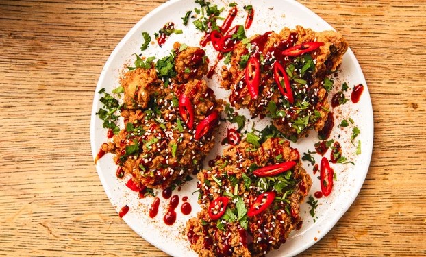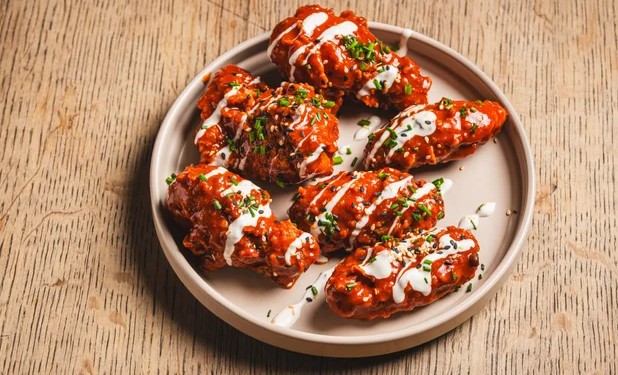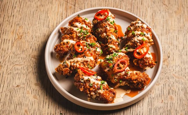 Crispy thighs drizzled with homemade buffalo sauce and hot honey. Topped with feta and aged stilton crumb. Garnished with chives and sesame seeds.
