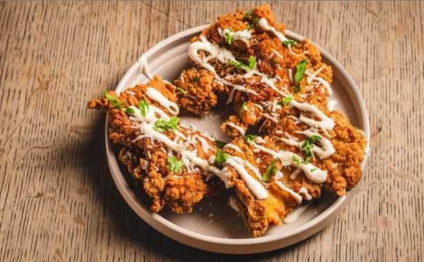 Tenders drizzled in kbbq sauce and kimchi lime mayo. Garnished with spring onion and sesame.