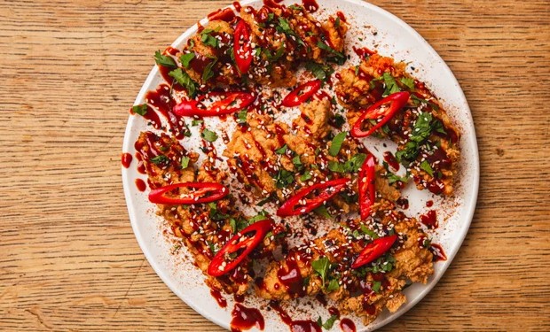 Crispy thighs drizzled with hot honey and our house sauce. Garnished with chives and sesame seeds.
