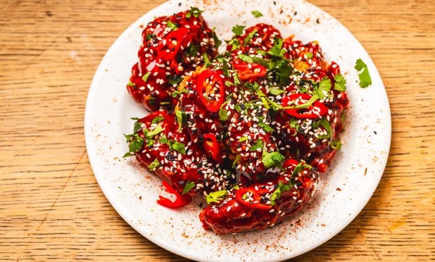 Crispy wings tossed in bbq sauce and drizzled with kimchi lime mayo. Garnished with spring onion and sesame.
