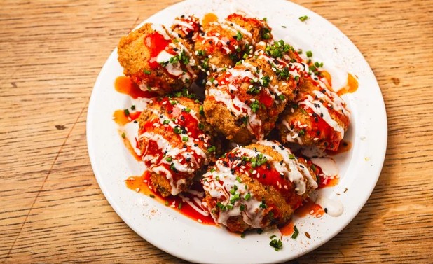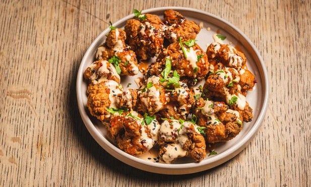 Crispy cauliflower wings drizzled with hot honey and our house sauce. Garnished with chives and sesame seeds.